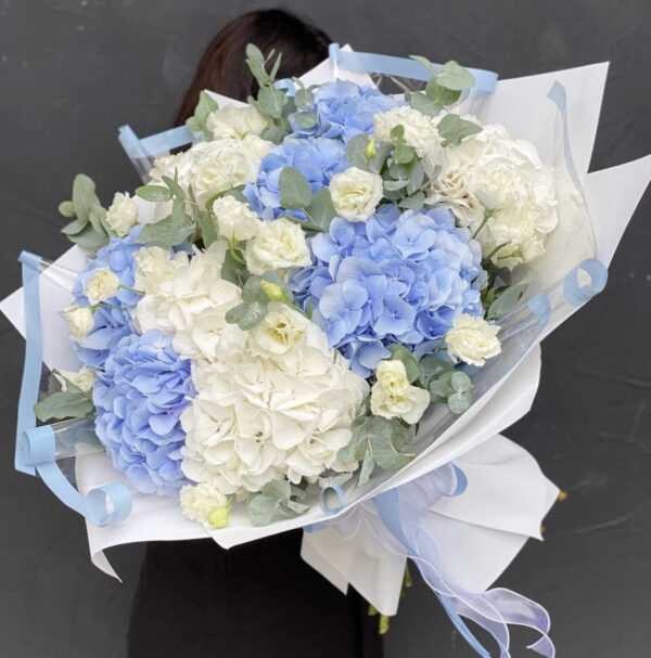 Гортензія, єустома, евкаліпт, калька, стрічка.