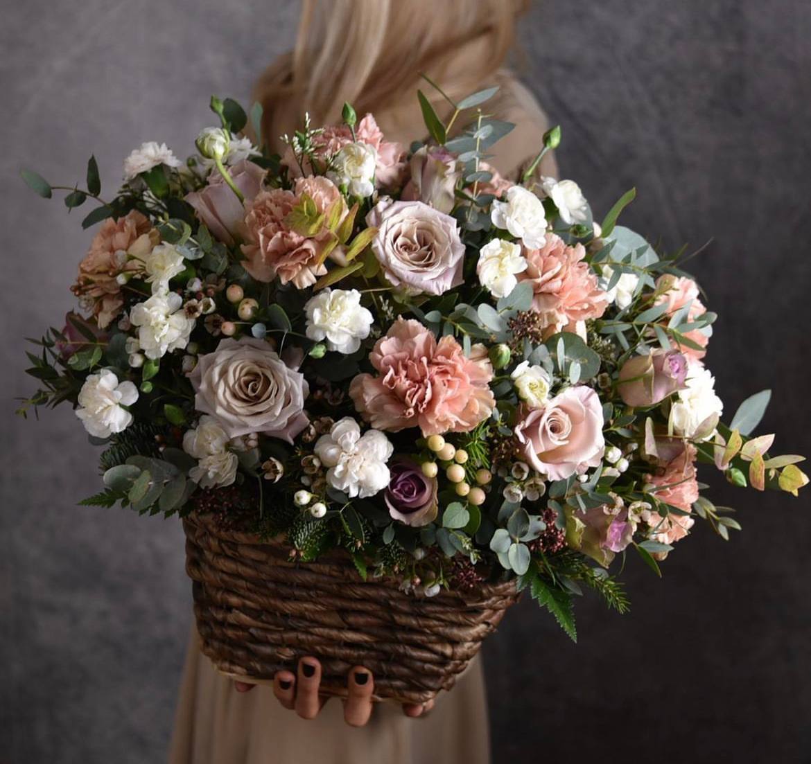 Троянда, гвоздика, скабіоза, еустома, хвоя, евкаліпт, кошик
