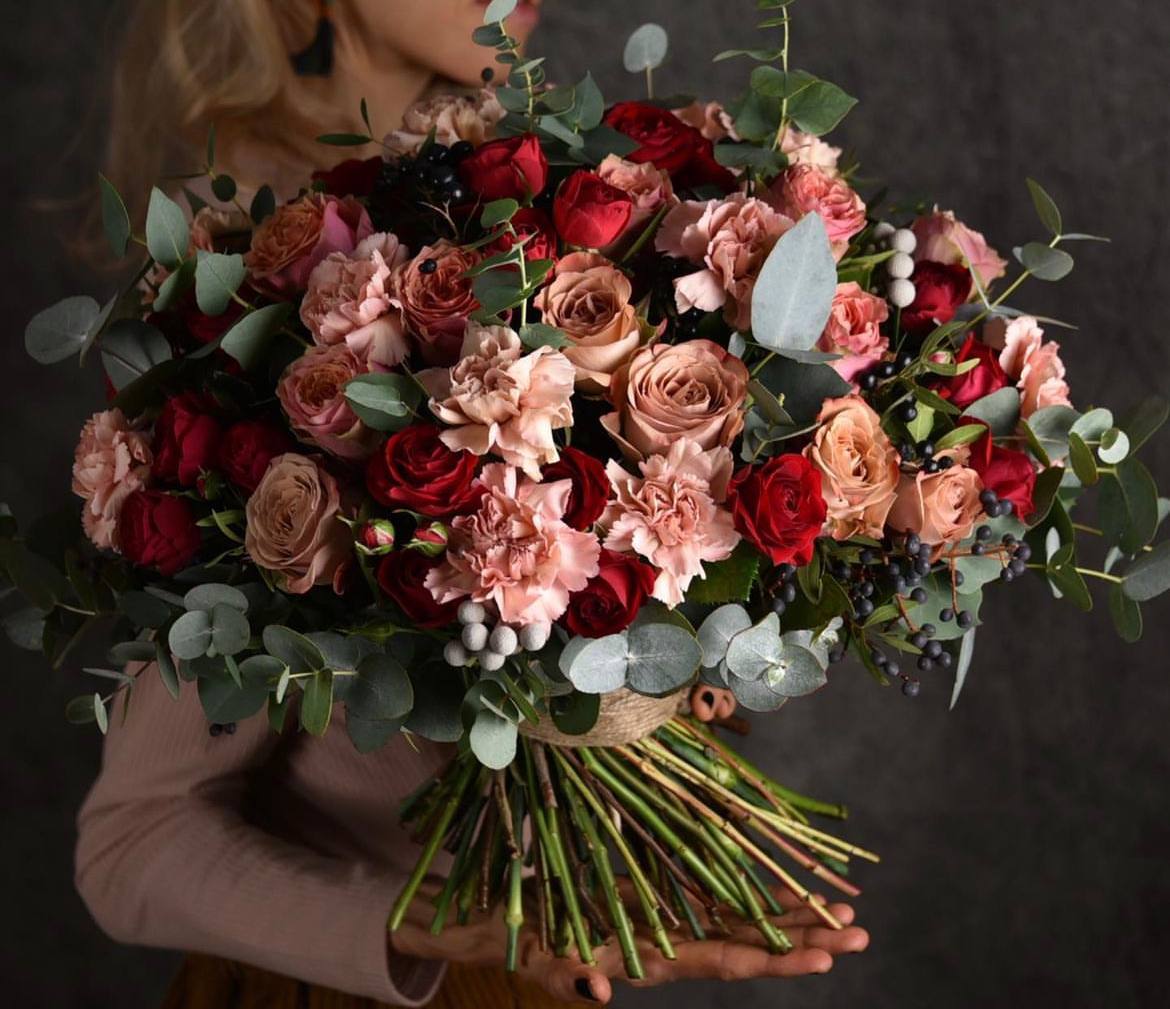 Гвоздика, троянда, євкаліпт, брунія, стрічка.