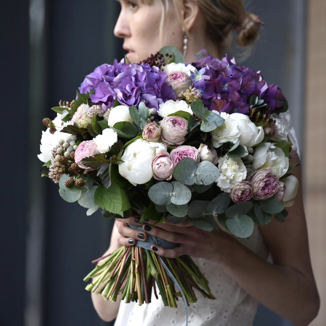 Гортензія, півонія, троянда спрей, еустома, брунія, евкаліпт, калька, стрічка.