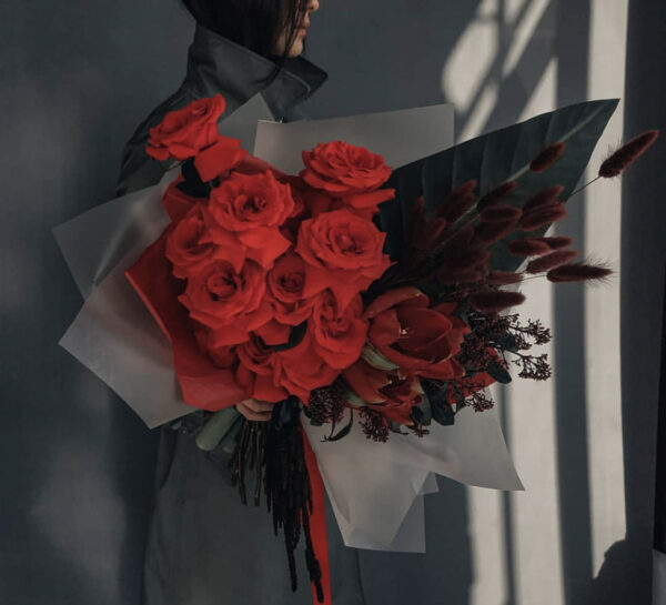 Троянда, амариліс, скімія, лагурус, листя, калька, стрічки.