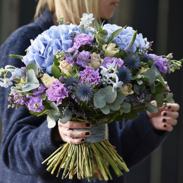 Гортензія, матіола, гвоздика, троянда, оксіпеталум, еустома, ерінгіум, вероніка, евкаліпт, стрічка.