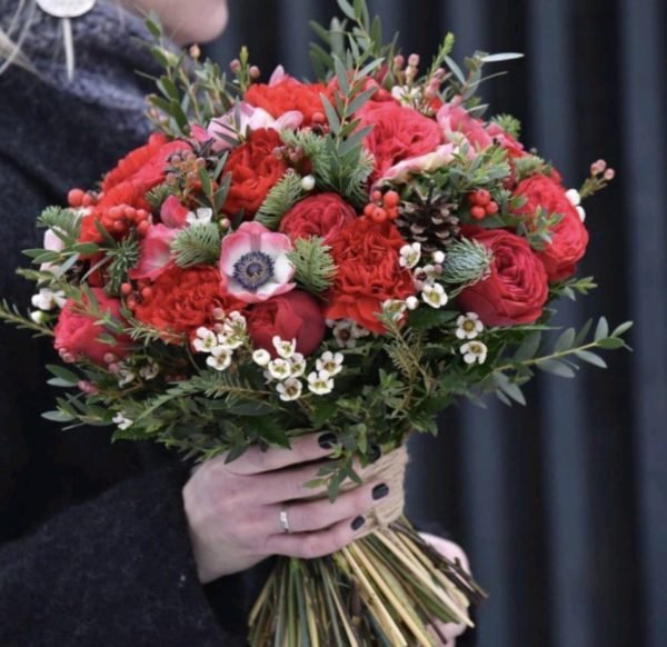 Анемон, гвоздика, троянда піоновидна, хаммелациум, нобелес, ілекс, сезонна зелень.