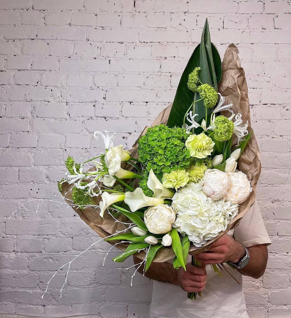 Гортензія, піони, тюльпани, кала, вібурнум, гвоздика, екзотика, гілки, листя, калька, стрічка.