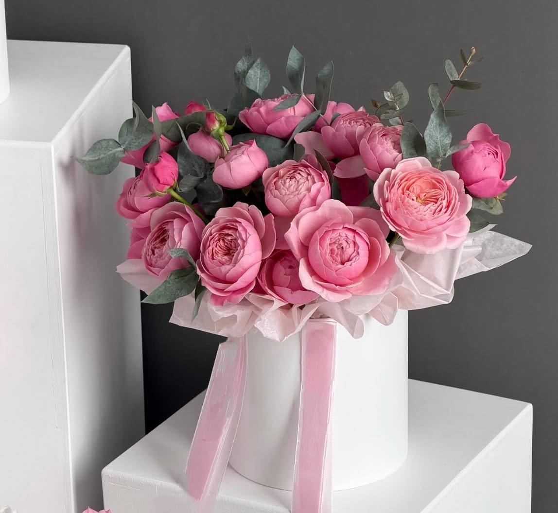 Кущьова троянда, евкаліпт, коробка, стрічка