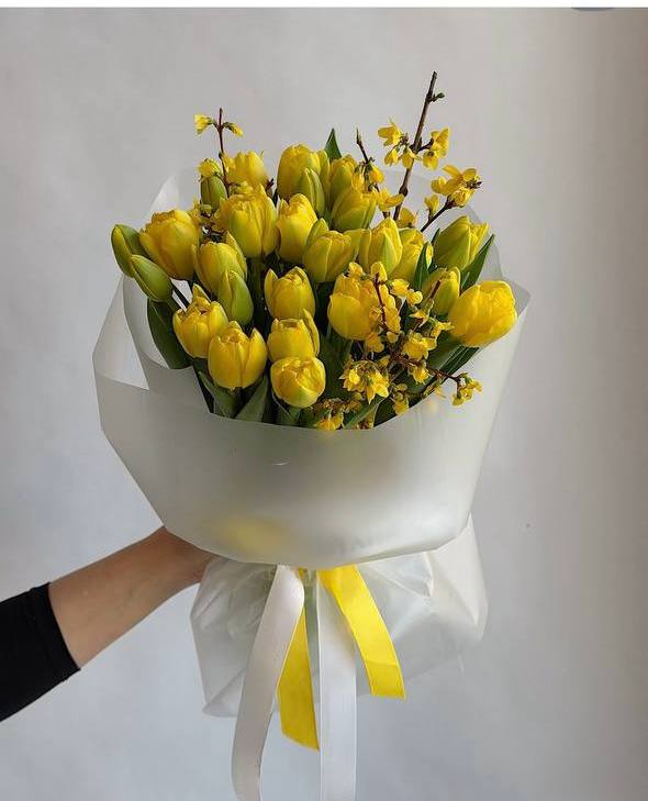 Тюльпан, гілки форзиції, калька, стрічка.