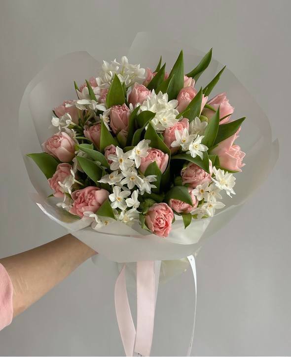 Піоноподібні тюльпани, нарцис, калька, стрічка.