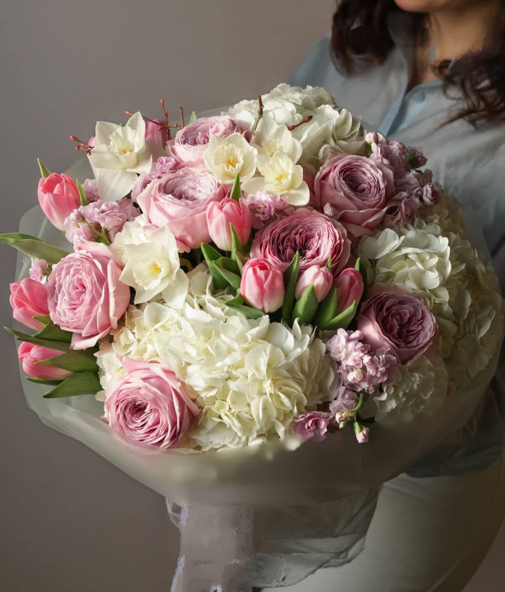 Гортензія, піовоноподібна троянда, тюльпан, нарцис, гвоздика, калька, стрічка