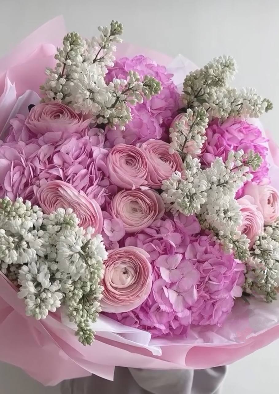 Гортензія, ранункулюс, бузок, калька, стрічка.