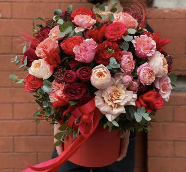 Троянда спрей, лагурус, скіммія, ранункулюс, евкаліпт, коробка, стрічка.