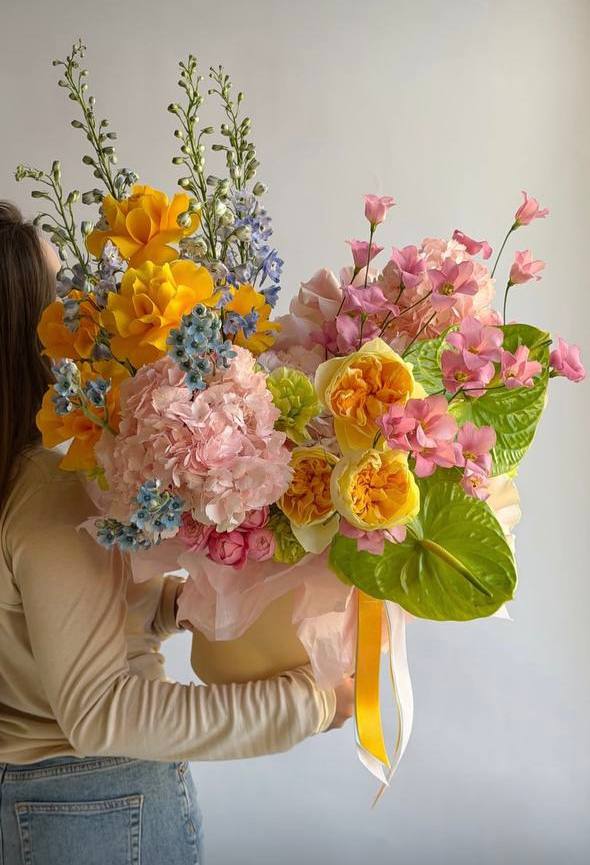 Гортензія, дельфініум, антуріум, троянда, еустома, вібурнум.