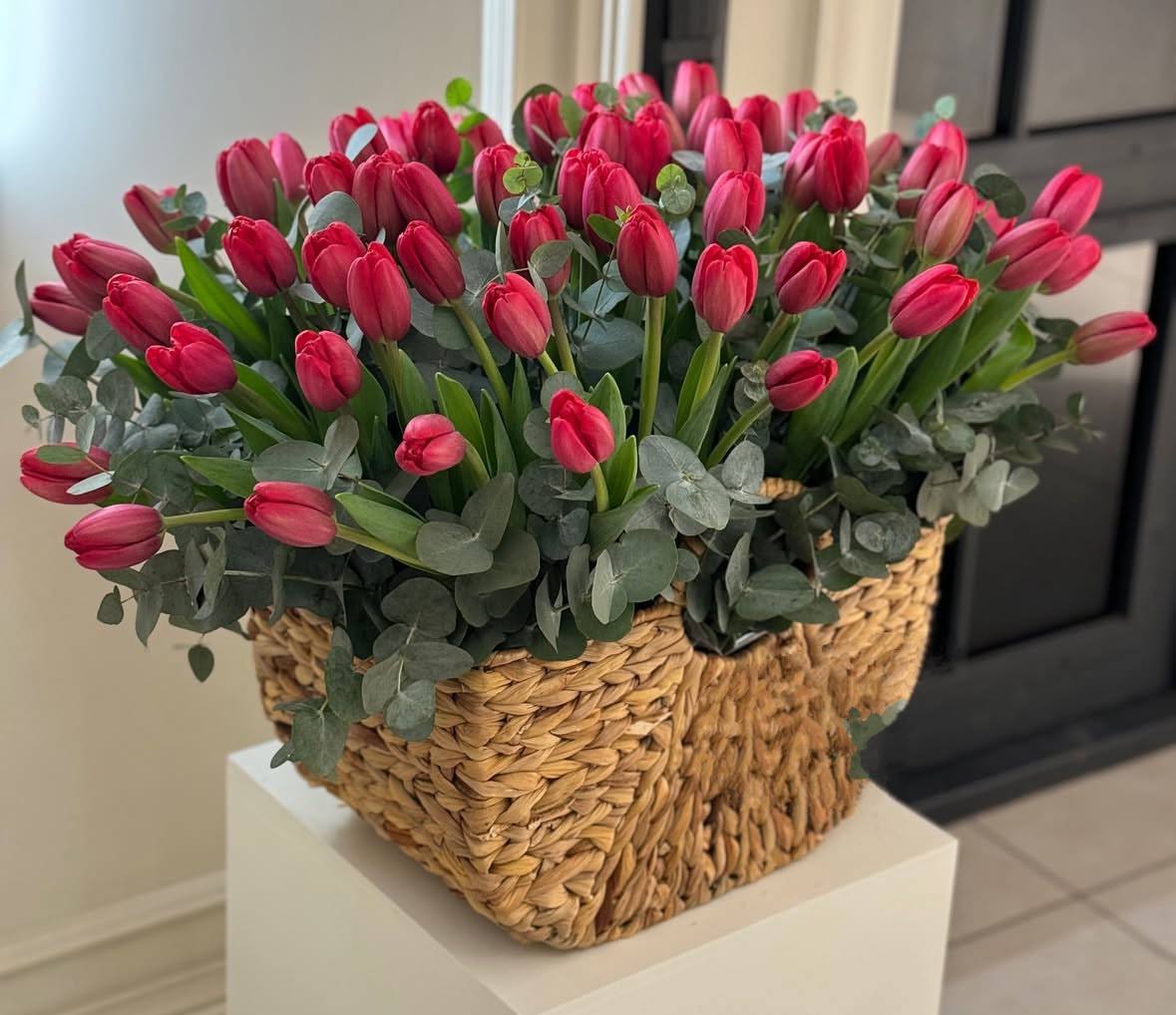 Кошик червоних тюльпанів з евкаліптом