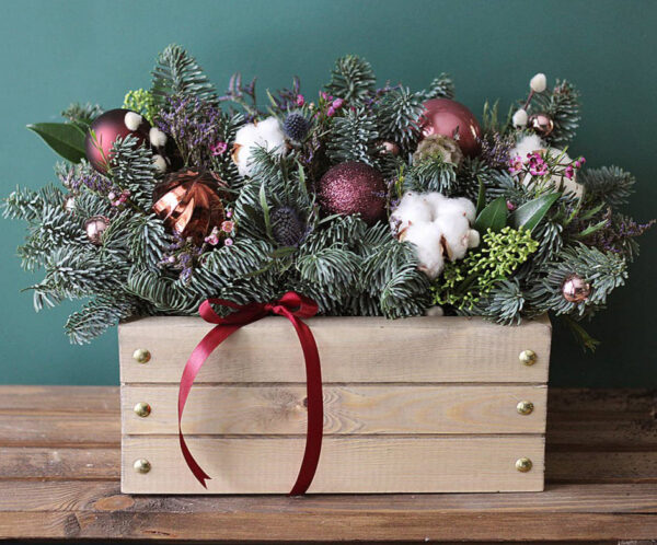 Хвоя, бавовна, ерінгіум, декор, іграшки, дерев’яний ящик.