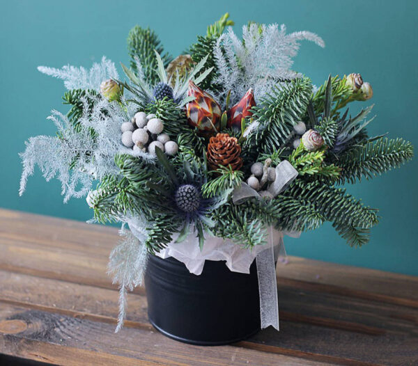 Хвоя, брунія, ерінгіум, аспарагус, шишки, декор, коробка.