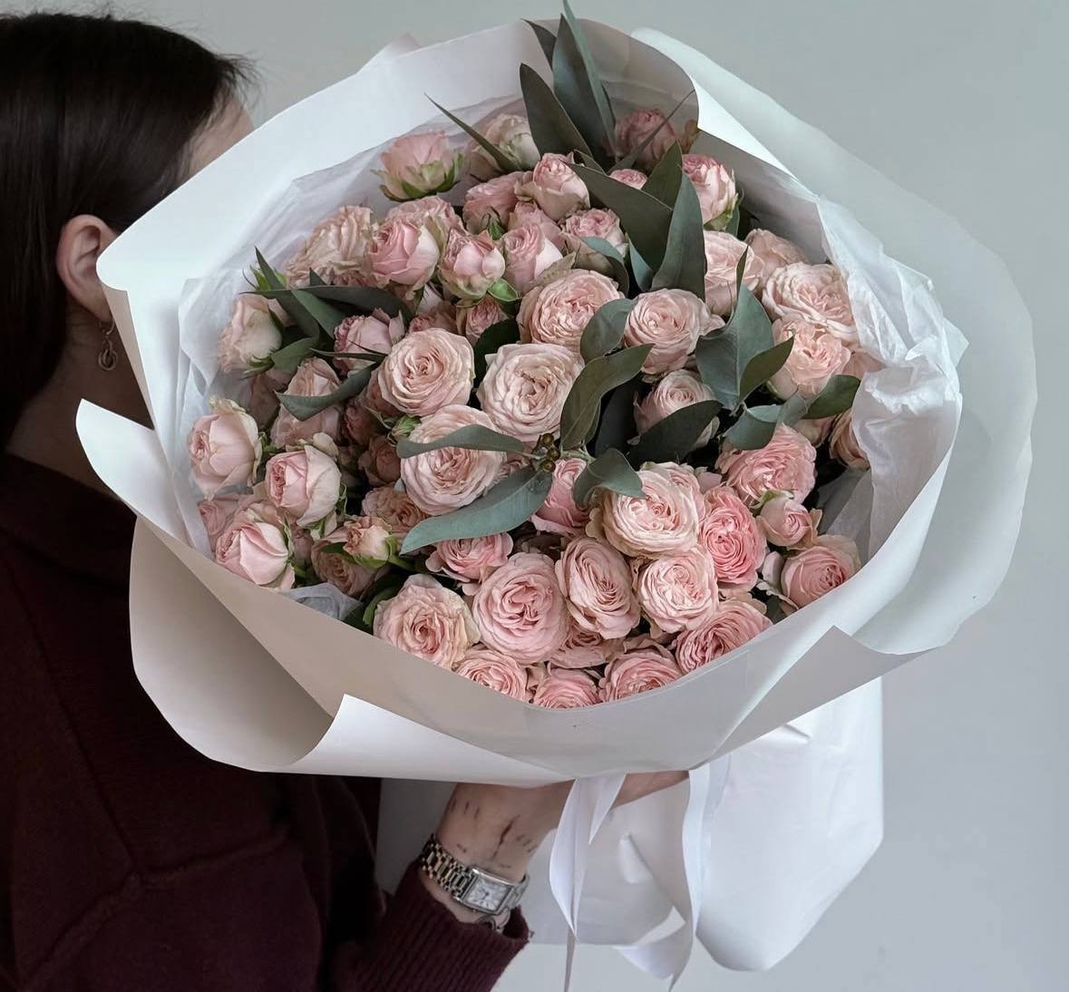 Кущьова півоноподібна трояда, евкаліпт, калька, стрічка