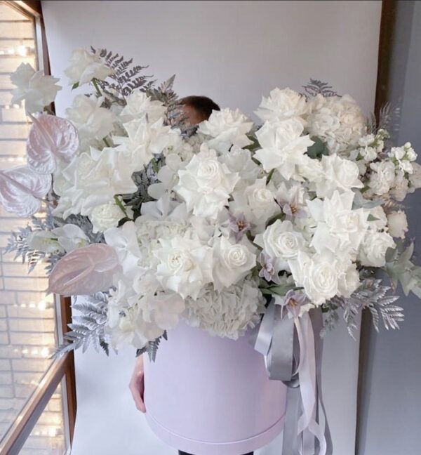 Троянда, гортензія, тюльпан, матіола, антуріум, орхідея, зелень, коробка.
