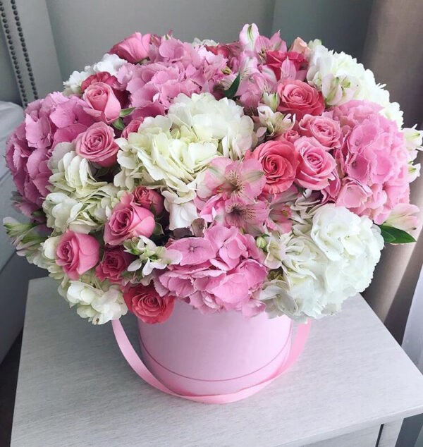 Гортензія, троянда, троянда спрей, альстремерія, коробка.