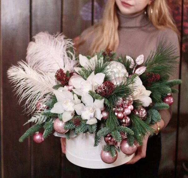 Орхідея, хвоя, новорічний декор, капелюшна коробка, стрічка
