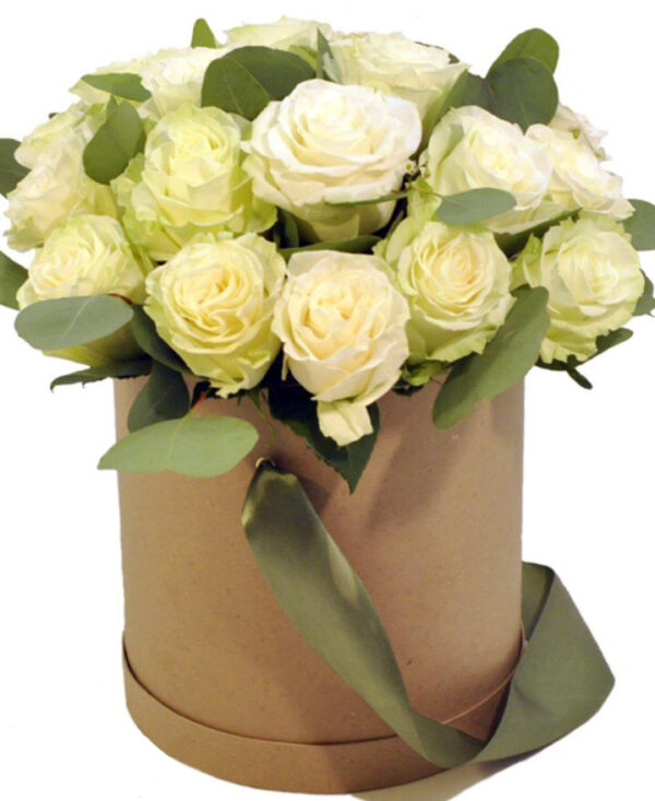 Троянда голландська, евкаліпт, капелюшна коробка.