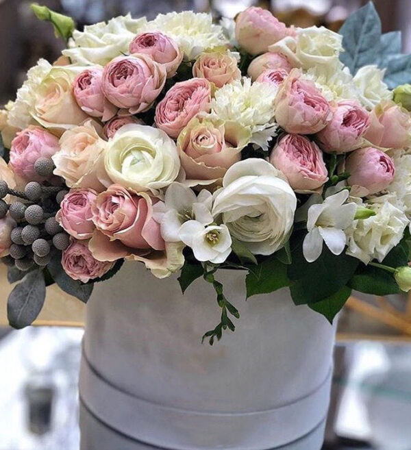 Троянда, троянда спрей, ранункулюс, фрезія, брунія, гвоздика, еустома, коробка.