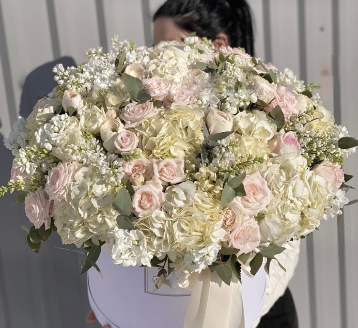Гортензія, троянда-спрей, бузок, евкаліпт, троянда, коробка.