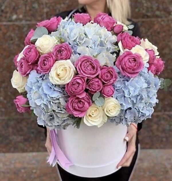 Гортензія, троянда, троянда спрей, евкаліпт, капелюшна коробка, стрічка