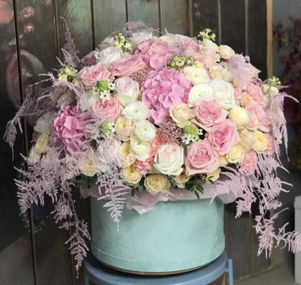 Гортензія, троянда, півонієподібна троянда спрей, ранункулюс, орнітогалум, рисова квітка, плюмозус, капелюшна коробка, стрічка