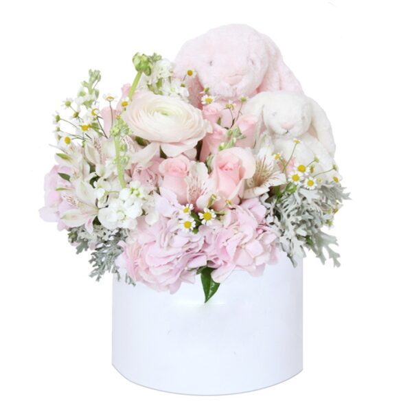 Гортензія, троянда, ранункулюс, альстремерія, еустома, танацетум, цинерарія, коробка, іграшка.