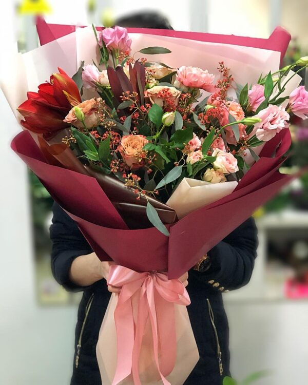 Амариліс, еустома, троянда, троянда спрей, гвоздика, протея, евкаліпт, калька, стрічка.