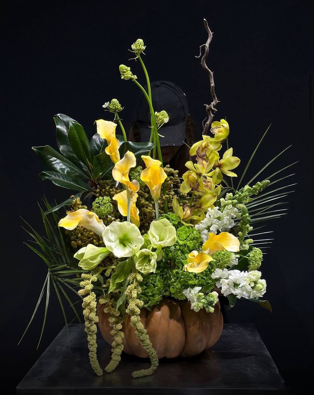 Кала, цимбідіум, гортензія, амарант, листя магнолії, орнітогалум, листя, коріліум, декор, тиква