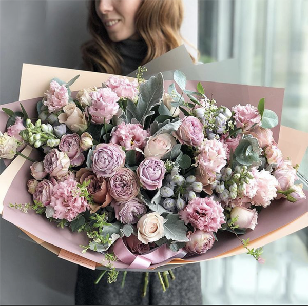 Троянда спрей, троянда, еустома, дельфініум, евкаліпт, калька, стрічка