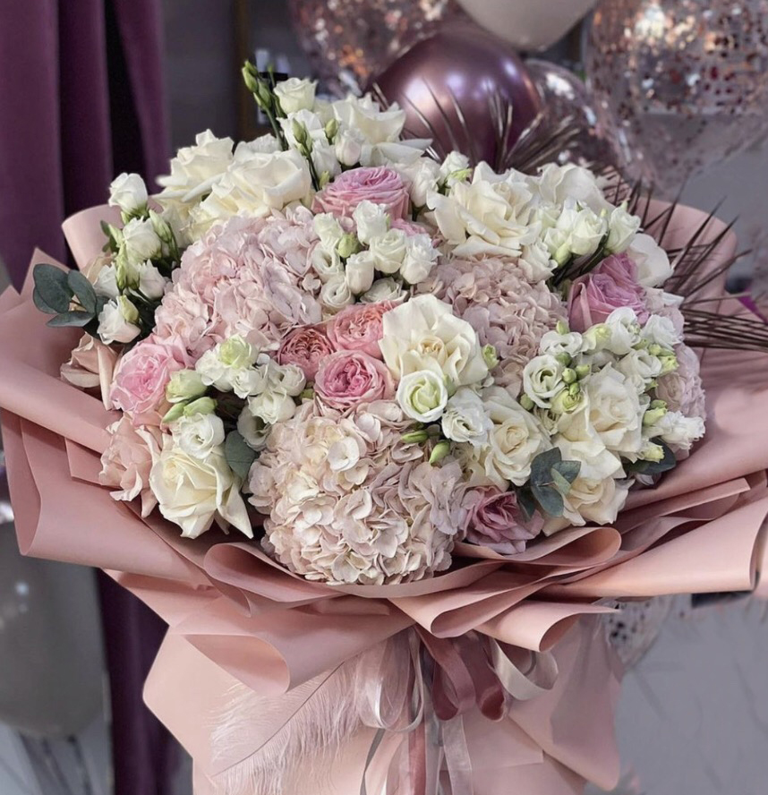 Гортензія, троянда, троянда спрей, фрезія, еустома, евкаліпт, фенікс, калька, стрічка