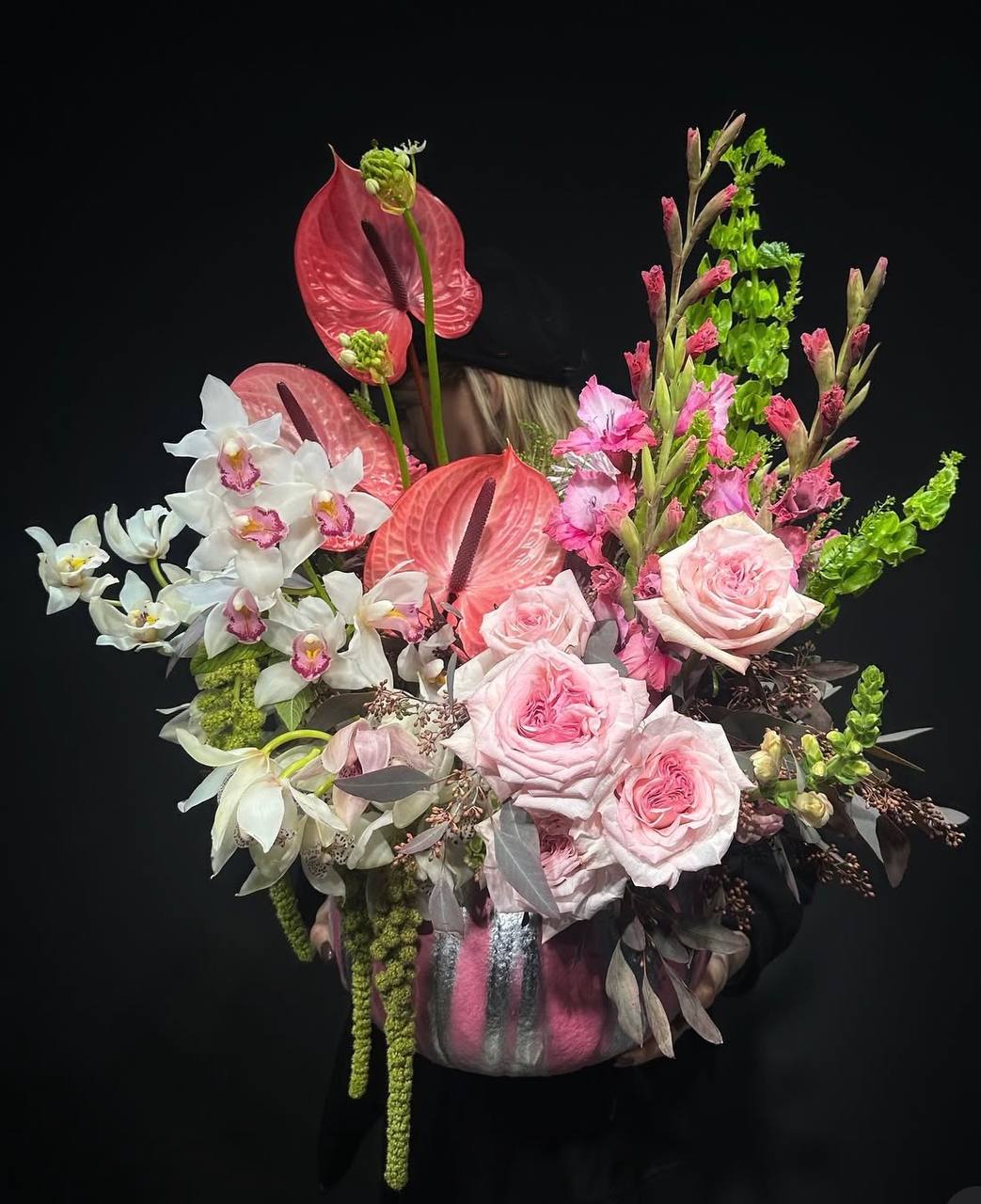 Амарант, антуріум, гладіолус, цимбідіум, троянда, евкаліпт, зелень, тиква